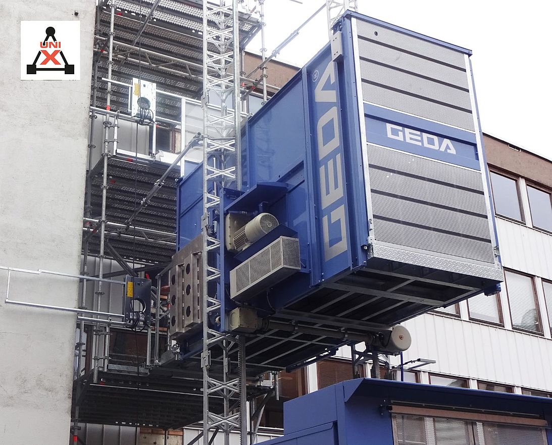 Der GEDA Multilift P18 überzeugt durch eine Tragfähigkeit von 2200 kg bzw. 25 Personen und einer Hubgeschwindigkeit von 40 m/min. Das Zwei-Mast-System garantiert stabiles Fahrverhalten bis in 150 m Höhe.
