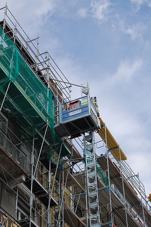 Dank zwei separaten Steuerungen kann die Transportbühne wahlweise als Bauaufzug oder Transportbühne für maximal drei Personen verwendet werden. In der Rue du Nideck kommt der GEDA 300 Z/ZP als reiner Bauaufzug mit einer Hubgeschwindigkeit von 12 m/min zum Einsatz, denn für den Transport der Baumaterialien wird ein separater Mobilkran genutzt. Aufgrund der Gesundheitsrichtlinien, die sich der Endkunde selbst gestellt hat, wurde für den Personentransport die Transportbühne zur Verfügung gestellt. Wie bei allen GEDA-Zahnstangenaufzügen ist beim 300 Z/ZP die sogenannte Schmiereinrichtung serienmäßig enthalten, die für deutlich geringeren Verschleiß der Zahnstangen und Ritzel sorgt.